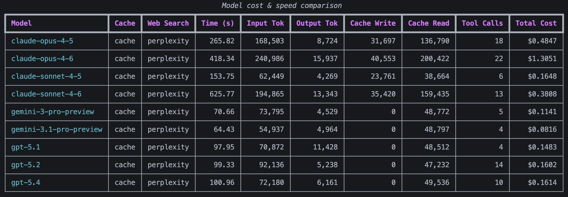 An interesting observation that can be made from this data is that the cheaper models like GPT 5.1, GPT 5.2, and Gemini 3 pro preview saved money by doing the web search themselves, whereas the more expensive models like Gemini 3.1 pro preview and the Claude models were cheaper when they offloaded the web searching to Perplexity.